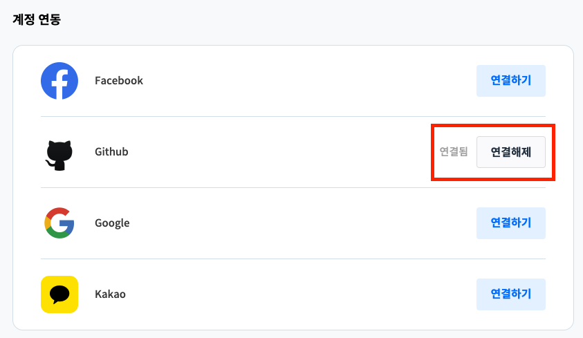 연동한 깃허브(GitHub) 계정은 마이페이지 > 계정관리 메뉴에서 변경할 수 있습니다.