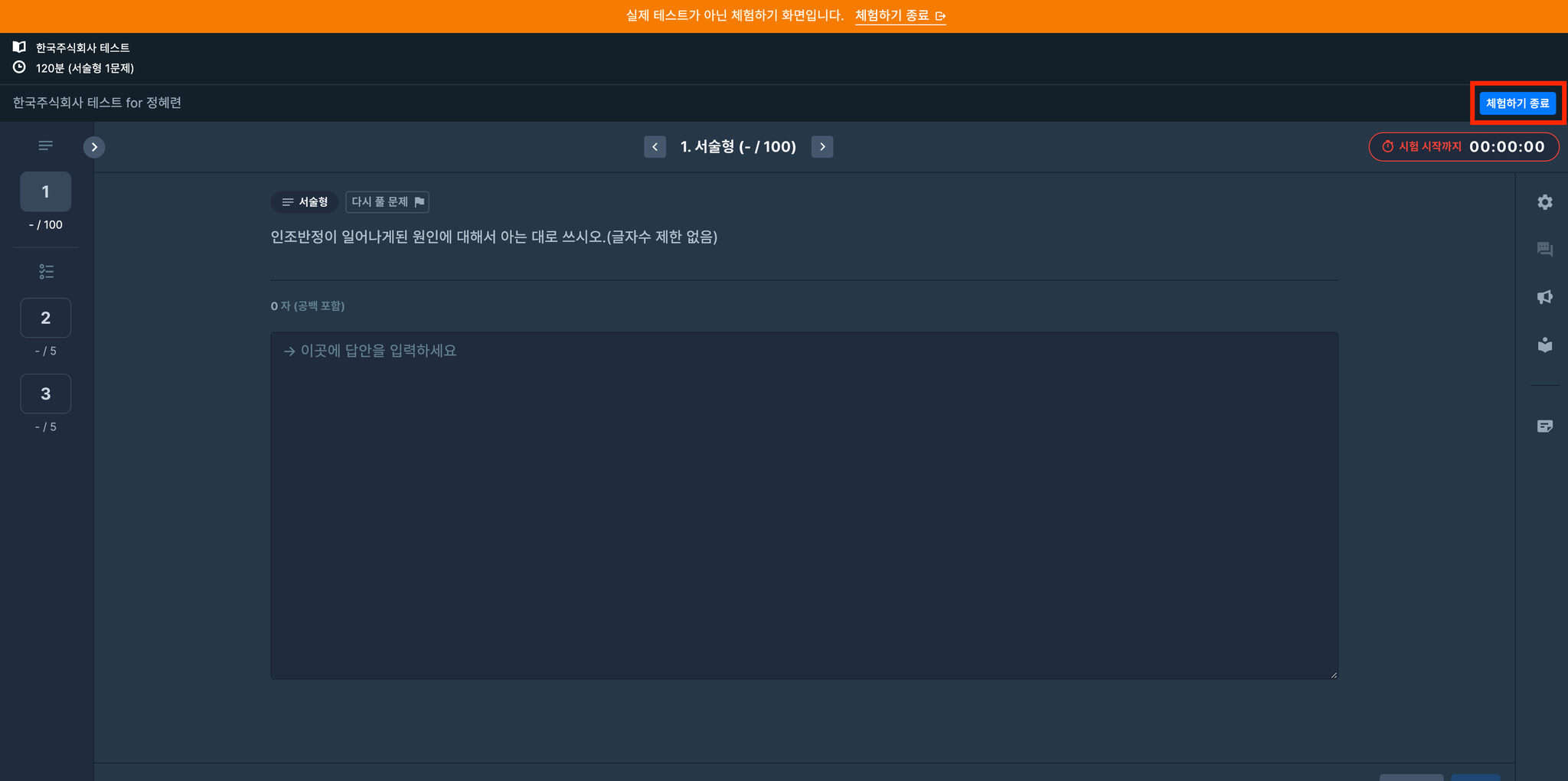 문제 풀이 환경을 모두 체험해 보신 후 오른쪽 상단의 체험 종료 버튼을 꼭! 클릭해주세요.버튼을 클릭하지 않는 경우, 사전 테스트 시 기기 연결을 하셨더라도,본 테스트에 참여하기 어려울 수 있습니다.