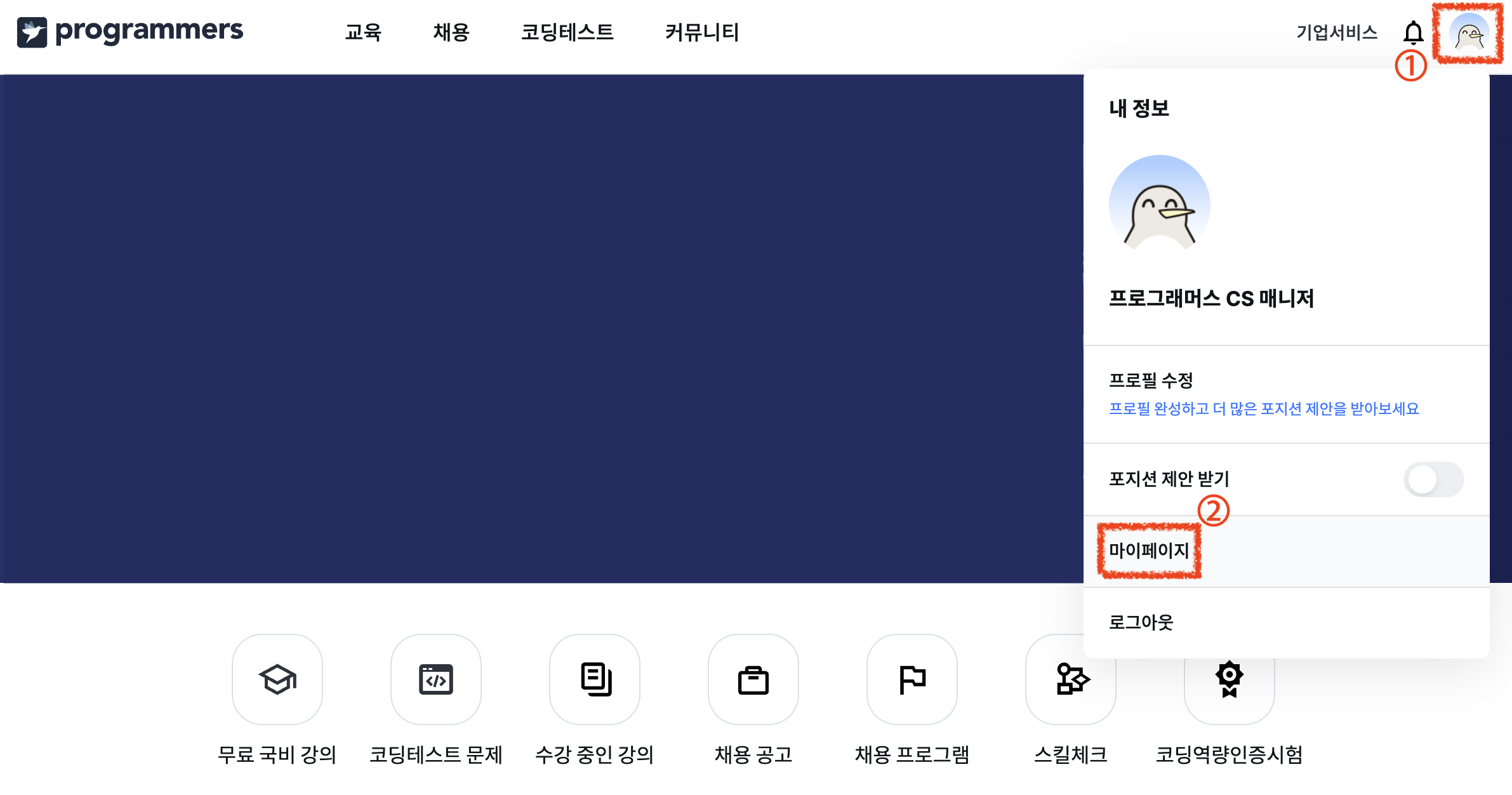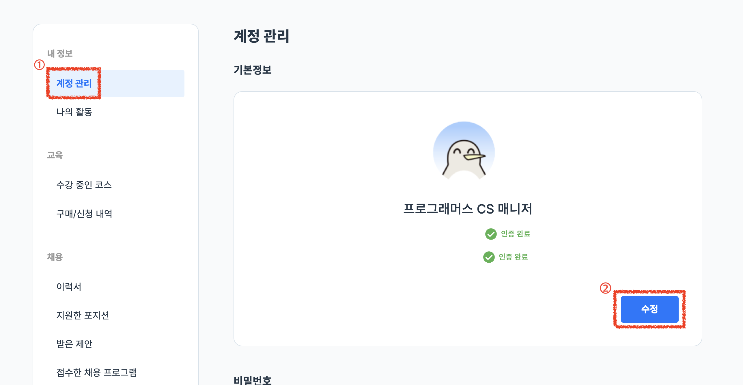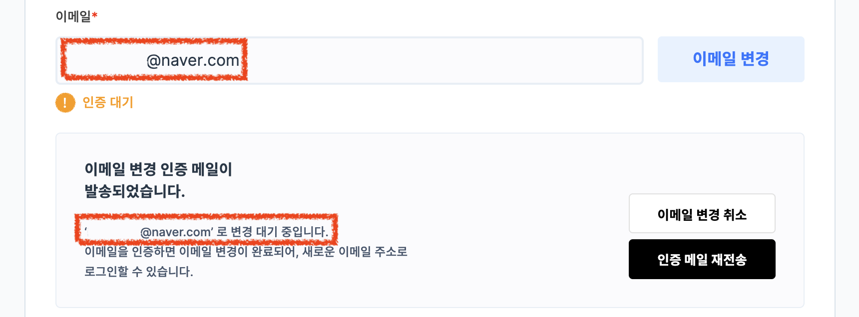 아래와 같이 이메일을 변경할 수 있습니다. 1. 우측 상단 프로필 이미지 → 마이 페이지 2. 계정 관리 → 수정 버튼 3. 새로운 이메일 주소 기입 → 이메일 변경 → 저장 4. 이메일 인증
